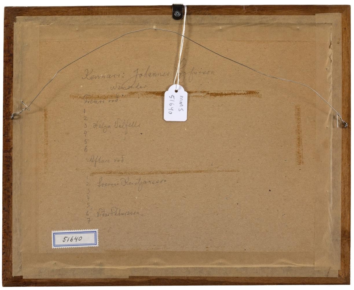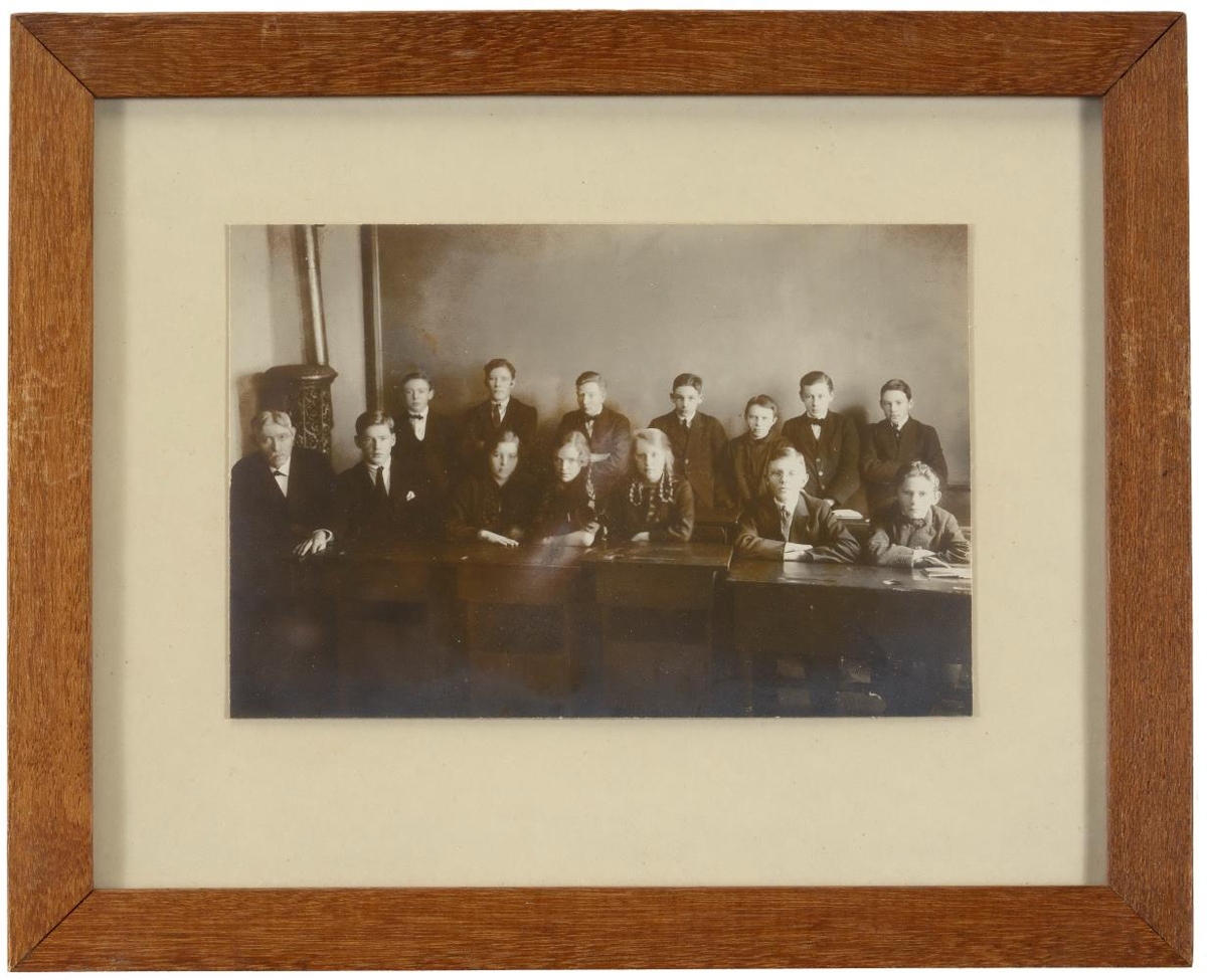 Bekkjarmynd úr MR tekin í skólastofu, kennari og 13 nemendur. Kennari Jóhannes Sigfússon. Líklega máladeild sama árgangs og 51639. Ljósm. 14 x 21 cm. í 2,5 cm br. ramma: Nöfn þekktra á bakhlið. Fremri röð f.v.: 2. Helga Valfells. Aftari röð f.v.: 2. Sverrir Kristjánsson, 6. Viðar Pétursson.