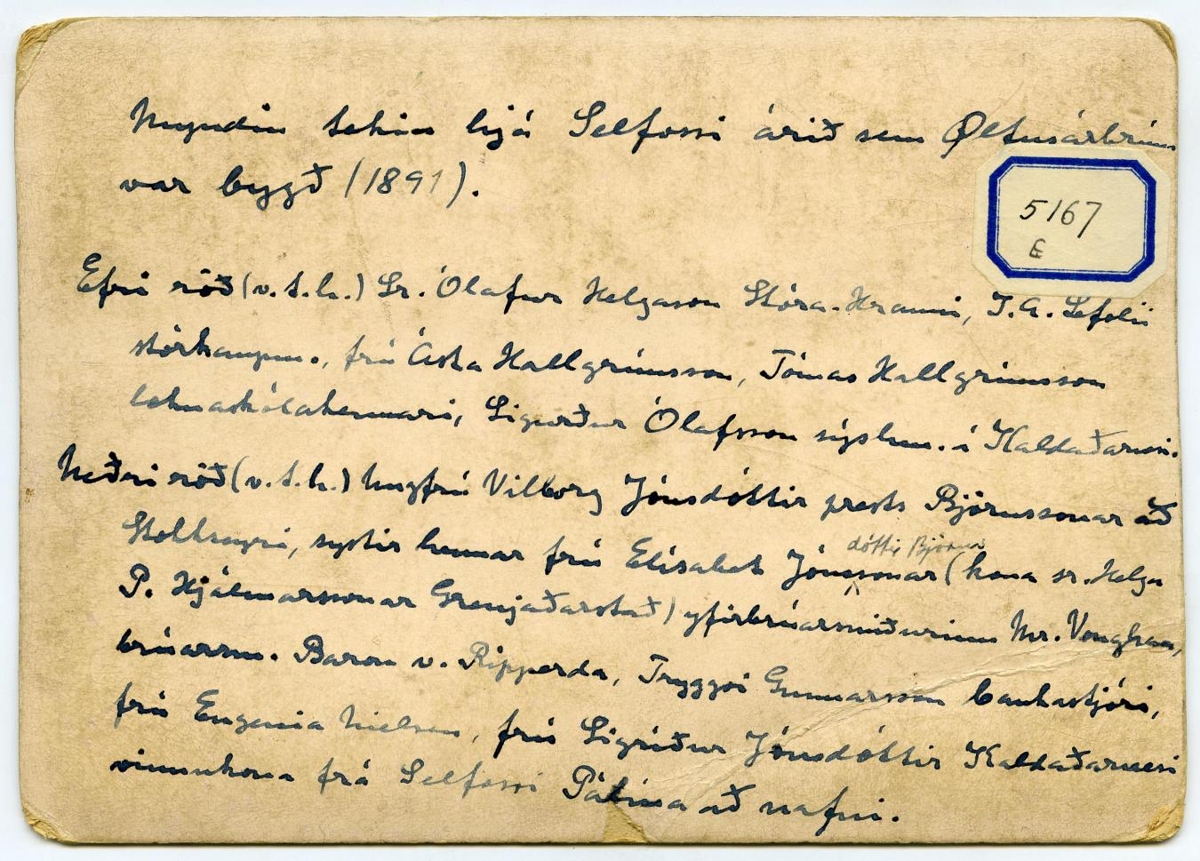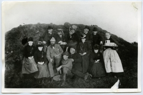 Hópmynd. Tryggvi Gunnarsson og brúarsmiðirnir að Selfossi er Ölfusárbrú var smíðuð og gestir þeirra: Sigurður sýslumaður Ólafsson í Kallaðarnesi og kona hans, Sigríður Jónsdóttir, séra Ólafur Helgason á Stóra - Hrauni, J. A. Lefolii stórkaupmaður, Tómas Hallgrímsson læknaskólakennari, kona hans frú Ásta og systir hennar, frú Eugenía Nielsen á Eyrarbakka, systurnar Vilborg og Elísabet dætur Jóns prests Björnssonar að Stokkseyri og stúlka frá Selfossi, Pálína Hallgerður Brynjólfsdóttir, sbr. aths. við 9985, e. fr. yfir-brúarsmiðurinn, Voughan og verkfræðingurinn, barón v. Ripperda.