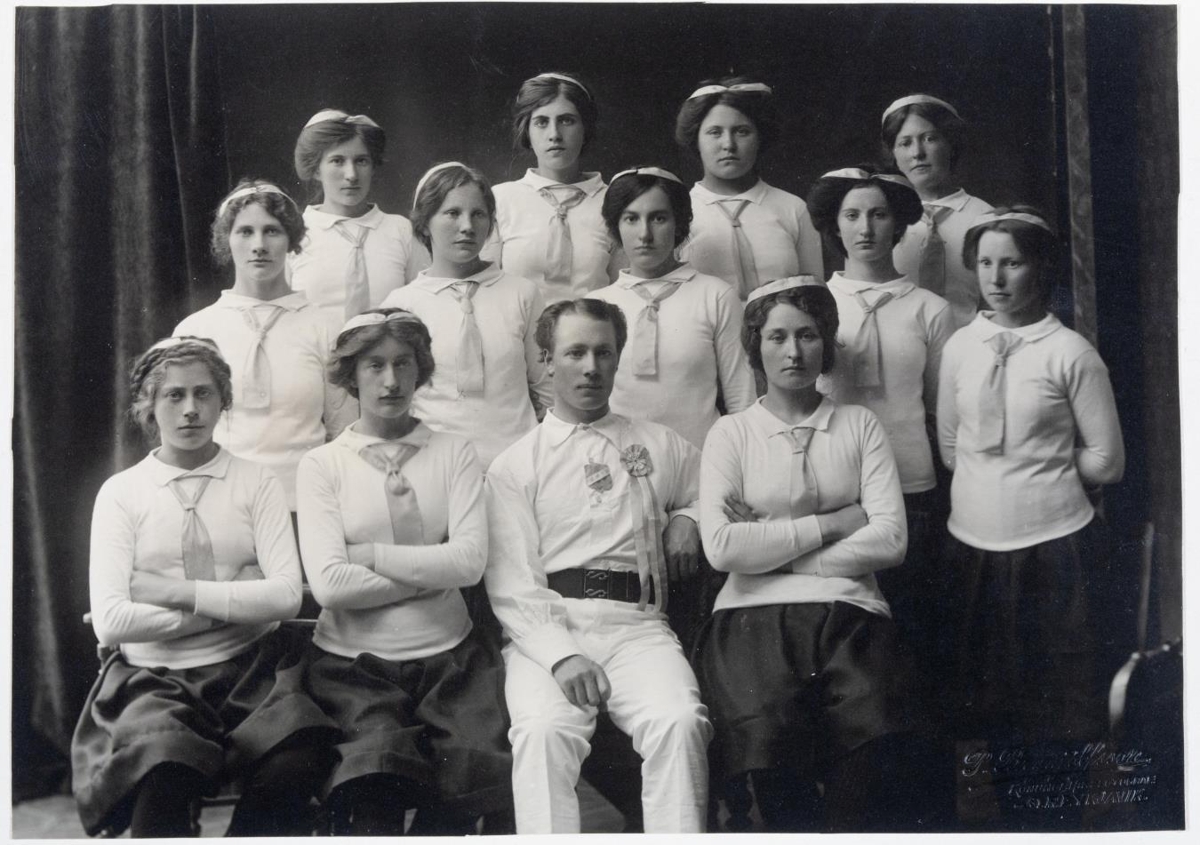 Leikfimistúlkur og kennari þeirra, Björn Jakobsson. Sama mynd og PBr2-25249.