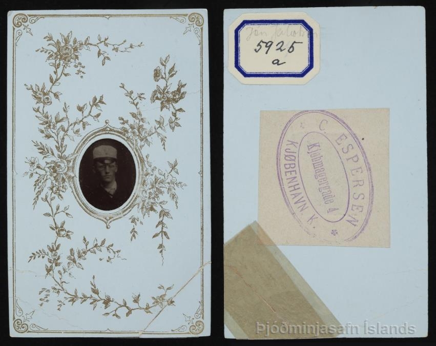 Jón Jakobsson, seinna Jacobson. Alþingismaður, forngripavörður, landsbókavörður; mjög smáar ljósmyndir, settar í eins konar pappaumgerðir, álíka stórar og venjulegar "visit"-myndir. Eru úr dánarbúi cand. mag. Boga Th. Melsteds sagnfræðings; komu til safnsins fyrir nokkrum árum [m.v. 1935], en hafa ekki verið tölusettar fyrr.