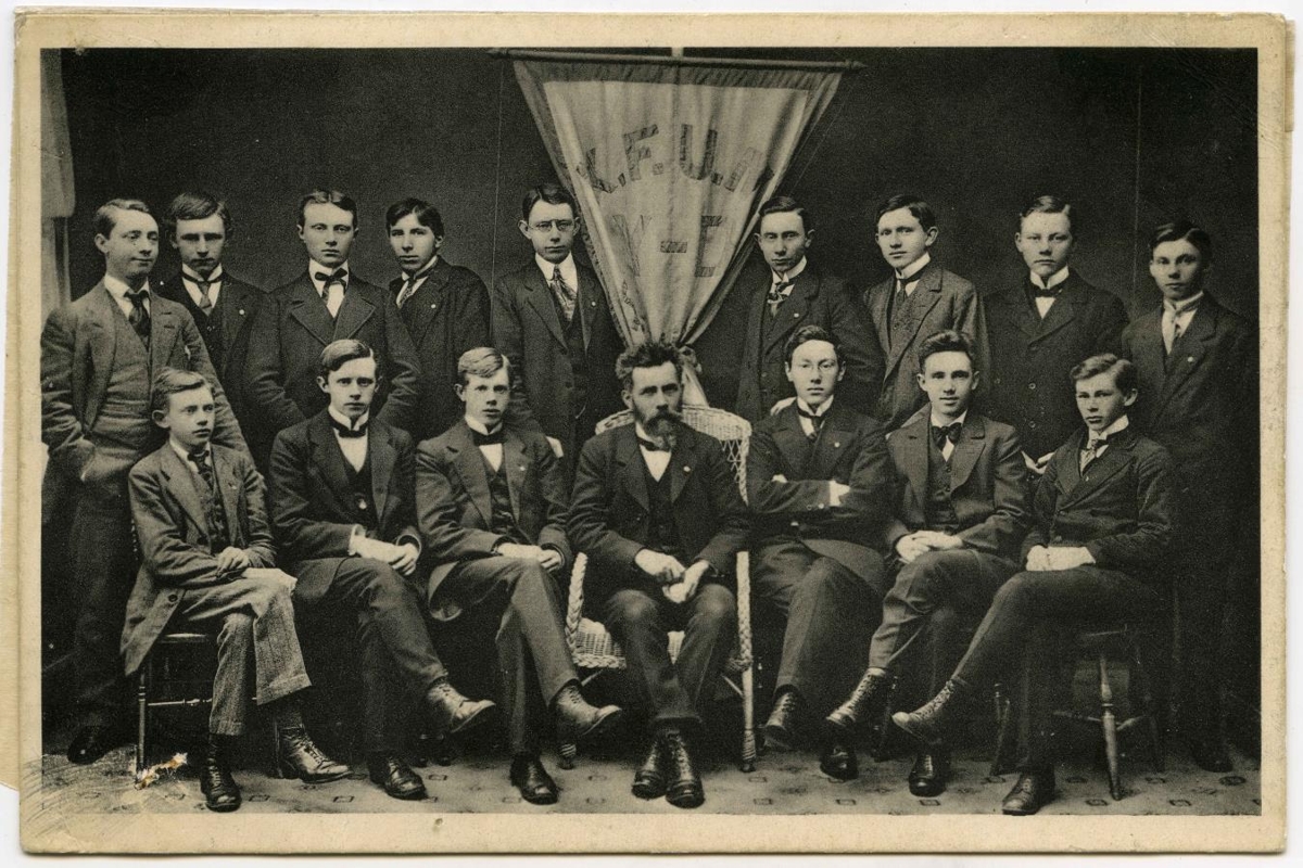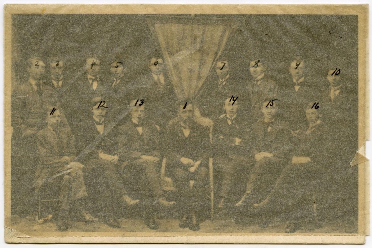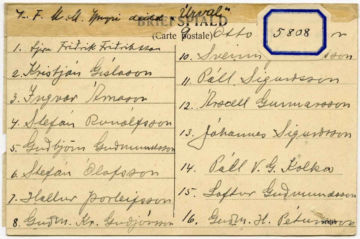 K. F. U. M. Bréfspjald, prentað, með "úrvali" úr yngri deild K. F. U. M. í Reykjavík, þessum 15 piltum með fyrirliðanum, séra Friðriki Friðrikssyni: Kristján Gíslason, Ingvar Árnason, Stefán Runólfsson, Guðbjörn Guðmundsson, Stefán Ólafsson, Hallur Þorleifsson, Guðmundur ? Guðjónsson, Ottó Jónsson, Sveinn Þorkelsson, Páll Sigurðsson, Ársæll Gunnarsson, Jóhannes Sigurðsson, Páll V. G. Kolka, Loftur Guðmundsson og Guðmundur H. Pjetursson.