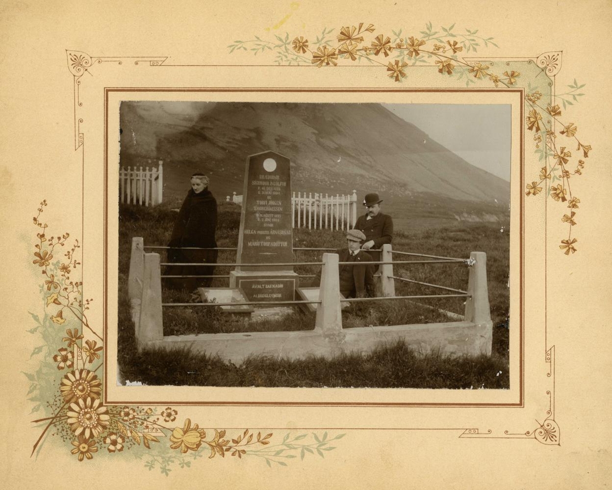 Séra Helgi Árnason, prestur að Kvíabekk, seinni kona hans, María Torfadóttir, og sonur þeirra, Árni, læknir, við legstað sona sinna, bræðra Árna, Sigurðar Ingólfs og Torfa Jörgens Thorgrímsens, st. 11 x 15; spjaldstærð 21,1 x 26,9.