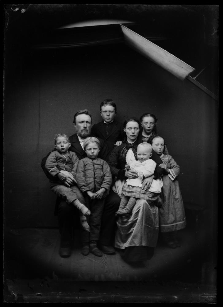 Átta manna fjölskylda. Stefán Sigfússon prestur á Hofi í Álftafirði og Malena Pálína Þorsteinsdóttir með börn sín Guðrúnu, SIgstein, Jófríði, Sveinbjörn, Stefán og Guðnýju. Sama og Mms-15983.