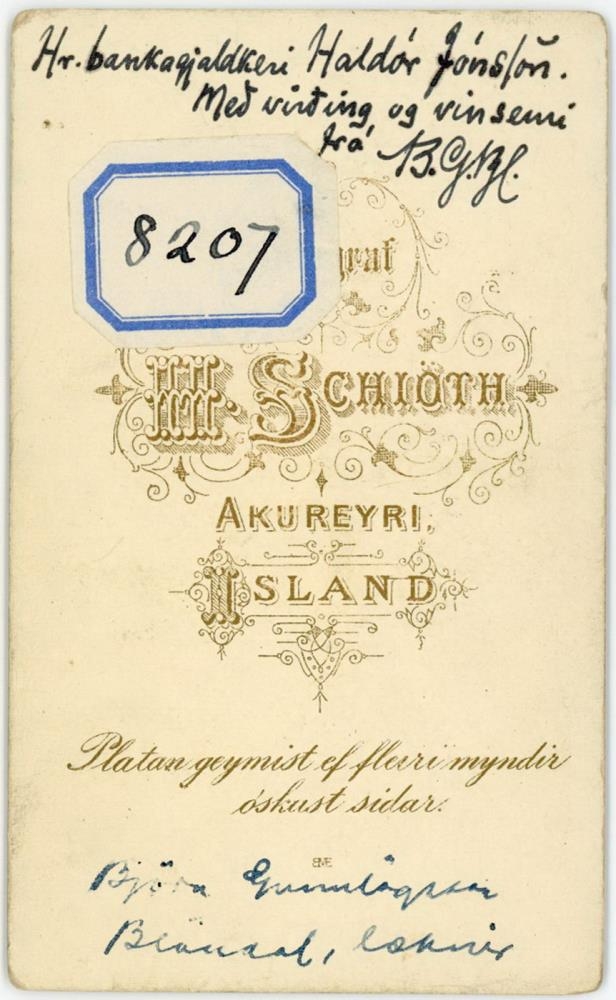 Aftan á mynd stendur: „Hr. bankagjaldkeri Halldór Jónsson. Með virðing og vinsemi frá B.G.BL."