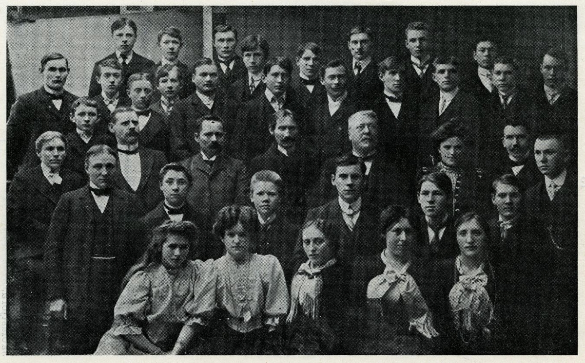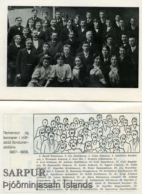 Verslunarskólinn, miðdeild, 1907-8, nemendur og kennarar, ljósmynd, st. 14,4 x 21,4 á spjaldi í umgjörð, br. 4,3. Stærð að utanmáli 36,2 x 42,7 cm. Skrá er með; enda er myndin prentuð í Merkúr, ársriti Nemendasambands Verslunarskóla Íslands. 1939, og er það nr. 79966 í þessu safni; sjá þar bls. 14-15. Skólastjóri er Ólafur G. Eyjólfsson og kennarar þau dr. Helgi Jónsson, dr. Björn Bjarnason, Jón Ólafsson (ritstjóri), dóttir hans Sigríður, og maður hennar Ágúst H. Bjarnason dr. phil, síðar prófessor.