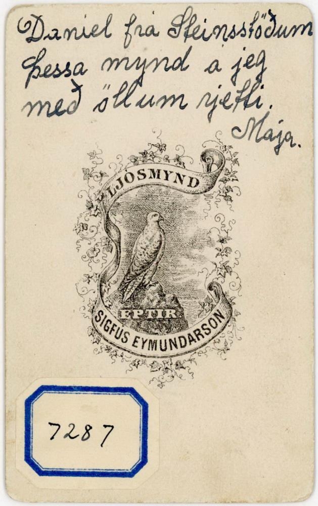 Á bakhlið myndarinnar er skrifað: „Daníel frá Steinsstöðum. Þessa mynd á jeg með öllum rjetti, Maja“.