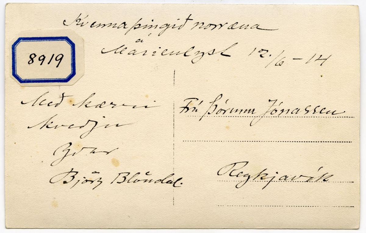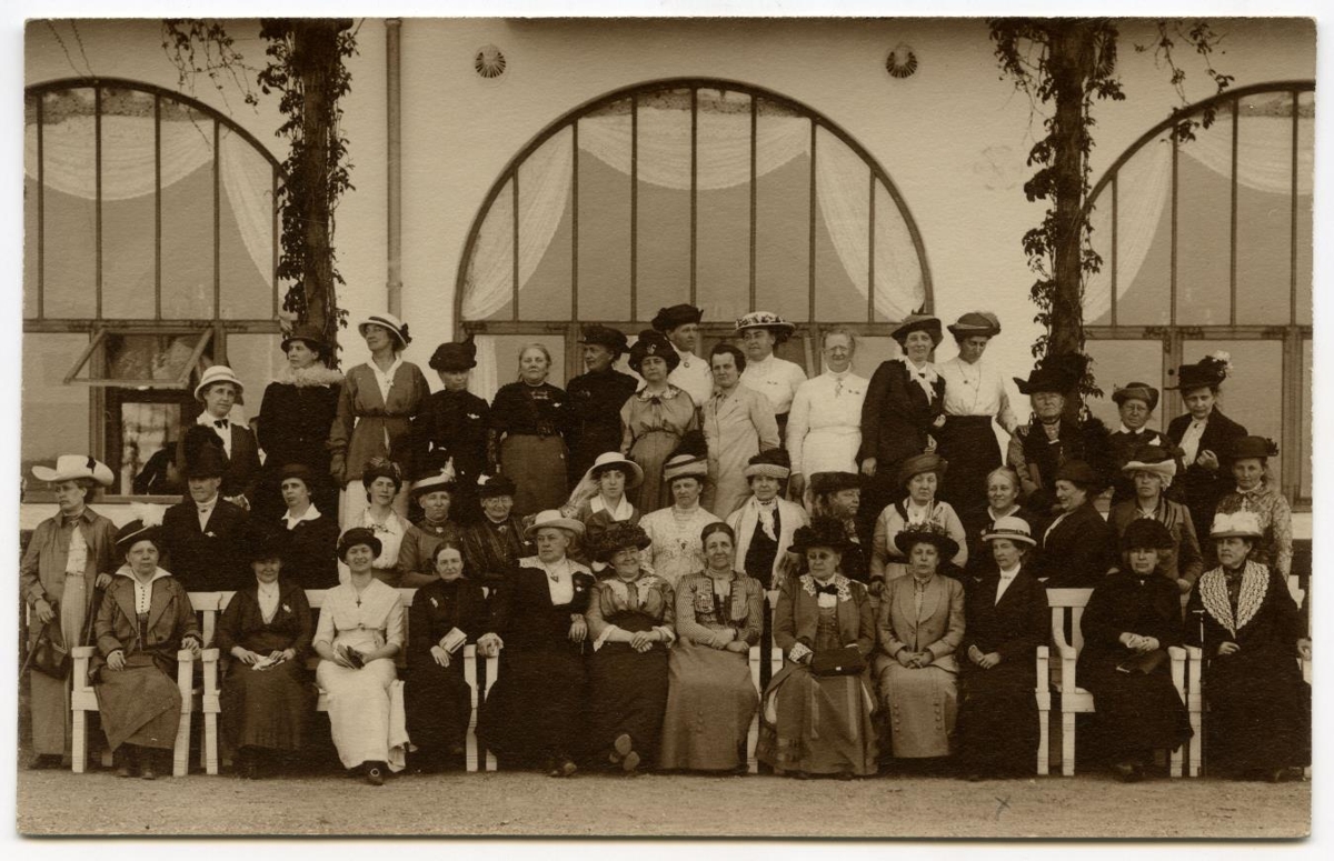 Bréfspjald. Björg Blöndal, fyrri kona drs. Sigfúsar Blöndals á kvennaþinginu norræna á „Marienlyst“ 12/6 1914, hun er nr. 3 frá hægri á fremstu röð. Bréfspjald.