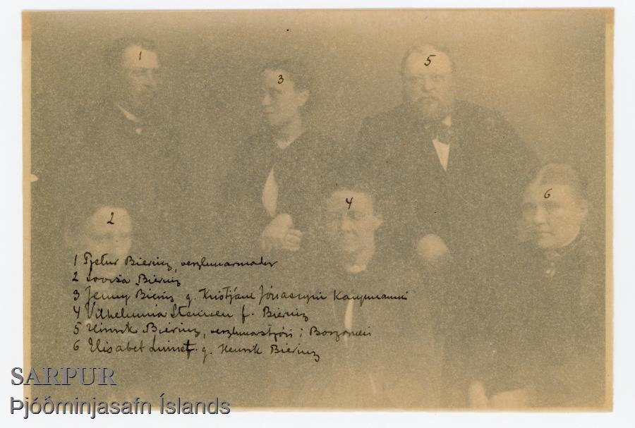 6 saman. Bierings-systkin, Pétur, verslunarmaður í Reykjavík, Hinrik, verslunarstjóri í Borgarnesi, Wilhelmína Steinsen,í Reykjavík, matsölukona, ekkja séra Steins Steinsens í Árnesi og Jenny Jónassen, ekkja Kristjáns Jónassens, kaupmanns í Reykljavík, e. fr. kona Péturs, Lovísa Biering og kona Hinriks Elísabet, f. Linnet (dóttir H. A. Linnets kaupmanns í Hafnarfirði).