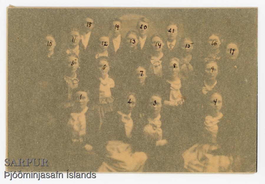 21 saman. 9207 a-b, hópmynd, neg. og pos. af saumastofu H. Andersen í Aðalstræti 16. Eru 21 persóna á myndinni, 17 saumastúlkur og 4 klæðskerar, þ. á. m. Ludv. Andersen, sonur H. Andersens, nú heildasali og konsúll í Reykjavík. Skrá er skrifuð aftan á myndina (pos.) og vísiblað sett fyrir.