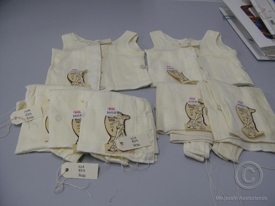 Þrír pakkar af Peter Pan vestum. Vestin eru gul, ermalaus og hneppt að framan. Þau eru ætluð fyir tveggja, fjögurra -og sex ára börn. Tvö og tvö saman í pakka. Mynd af Peter Pan Fleccy Bodices. Í einum pakkanum er þrjú stk. saman og eru ætluð fyrir 4 ára. Kosta kr. 645.- Framleiðandi Peter Pan. Made in England. Kom úr verslun Pálínu Waage.