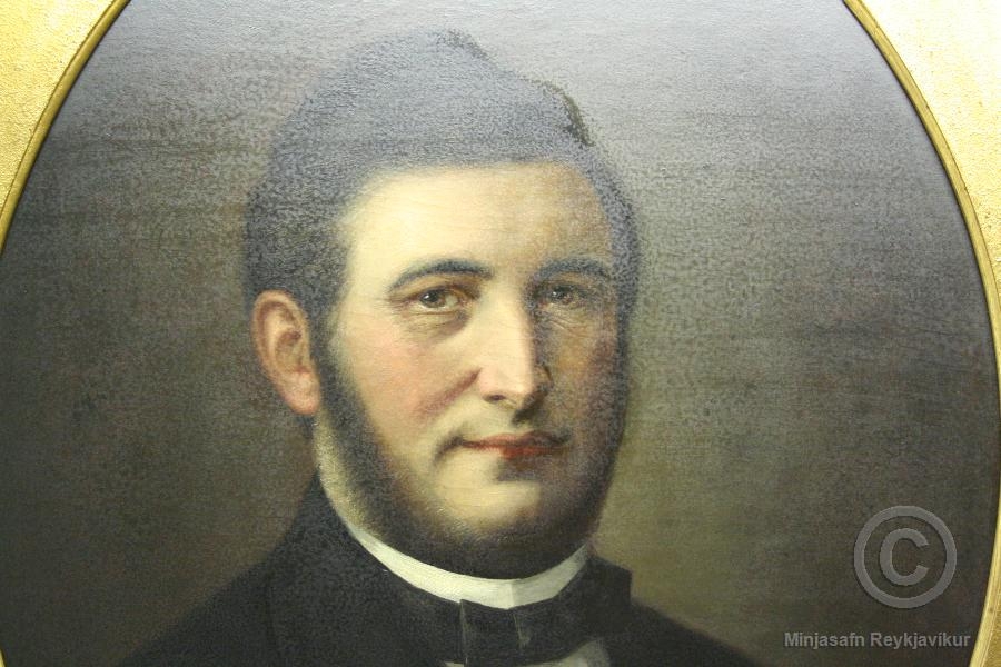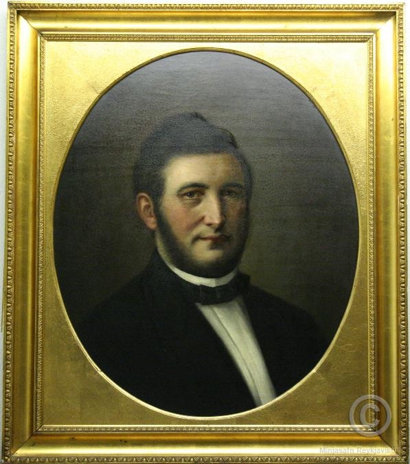Sporöskjulagað portrett af Waldemar Fischer, kaupmanni, í ferhyrndum ramma. Olía á striga.