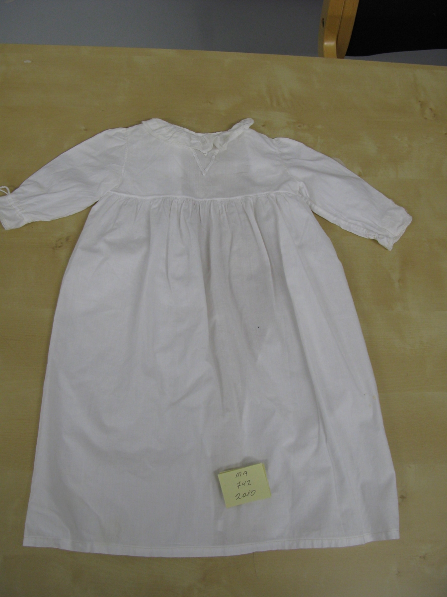 Hvítur léreftskjóll með löngum ermum og opin að aftan. Skyrtan er hneppt. Ermar eru með ídregnu bandi fremst þannig að það er eins og blúnda fremst. Hálsmál er með stórum kraga með tveimur litlum blúndum. Blúndur saumaðar í V að framan og hafa upphaflega verið þrjár en eru nú tvær. Sigrún saumaði kjólinn á fyrsta barns sitt, Einar Þór Halldórsson þegar hann fæddist 1945 í Bæjum á Snæfjallaströnd við Ísafjarðardjúp.
