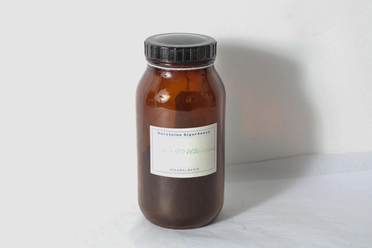 Lyfjakol. Stór brún glerkrukka með víðu svörtu loki. Svart duft í krukkunni. Á miða framan á henni stendur: "Þorsteinn Sigurðsson - Carbo Medicinal- Héraðslæknir".