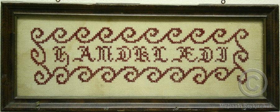 Krosssaumsmynd: „Handklæði“ saumað með rauðu garni á ljósan java.