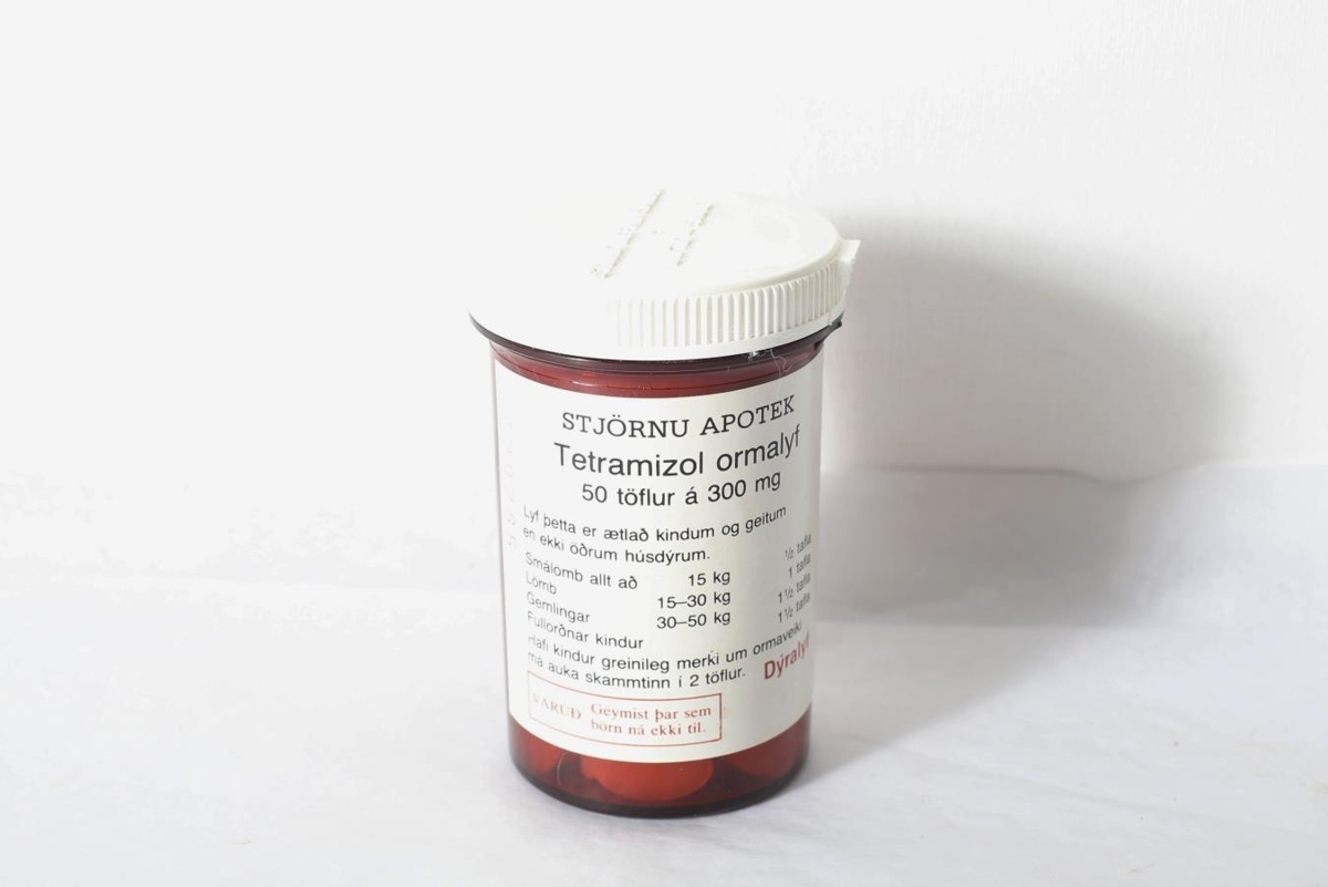Ein dós með hvítu plastloki og hvítum miða sem á stendur: "Stjörnu Apotek - Tetramizol ormalyf 50 töflur á 300 mg. Lyf þetta er ætlað kindum og geitum en ekki öðrum húsdýrum (meiri lesning á dósinni). Dýralyf. Ormalyf í kindur.