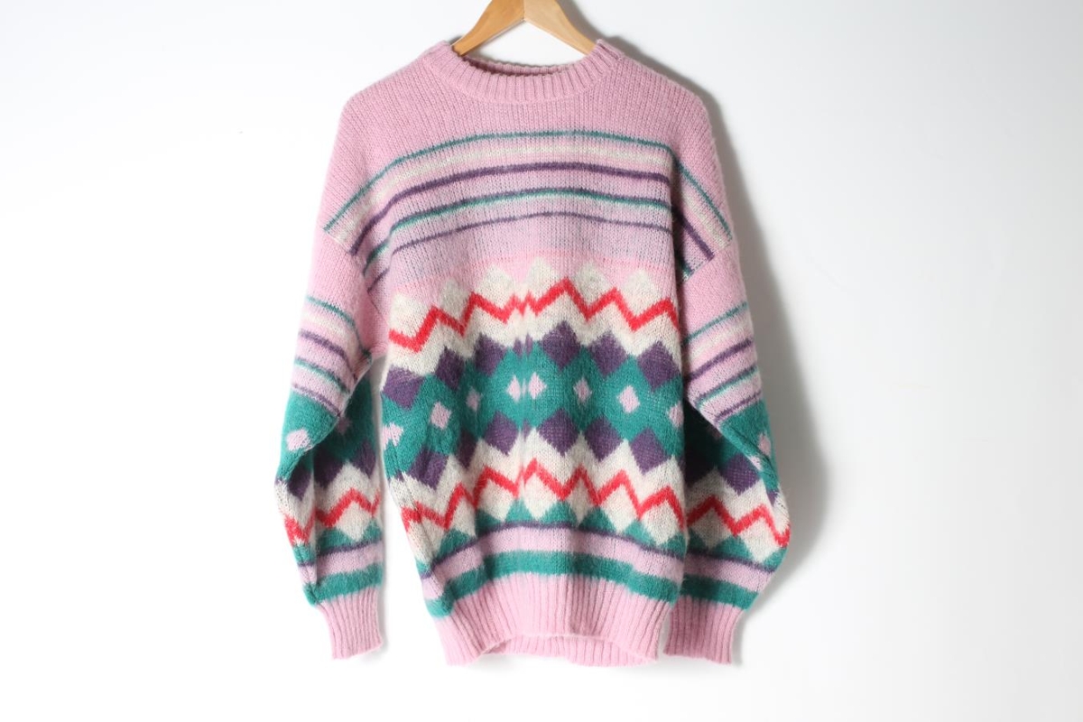 Ljósbleik með grænu og rauðu munstri. Þetta er ónotuð sýningarpeysa sem Ólafur Sigurðsson gaf safninu, en hann var aðalstarfsmaður Dyngju á sínum tíma og nánast eini starfsmaðurinn undir lokin. Á miða stendur; "Stærð L. Curly Product Egilsstaðir Iceland Dyngja hf Prjónastofa".