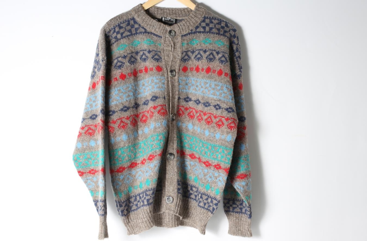 Hneppt ullarpeysa. Grá með rauðu, grænu og bláu mynstri. Stærð XL. "Curly product, egilsstaðir, Iceland Dyngja hf. prjónastofa".