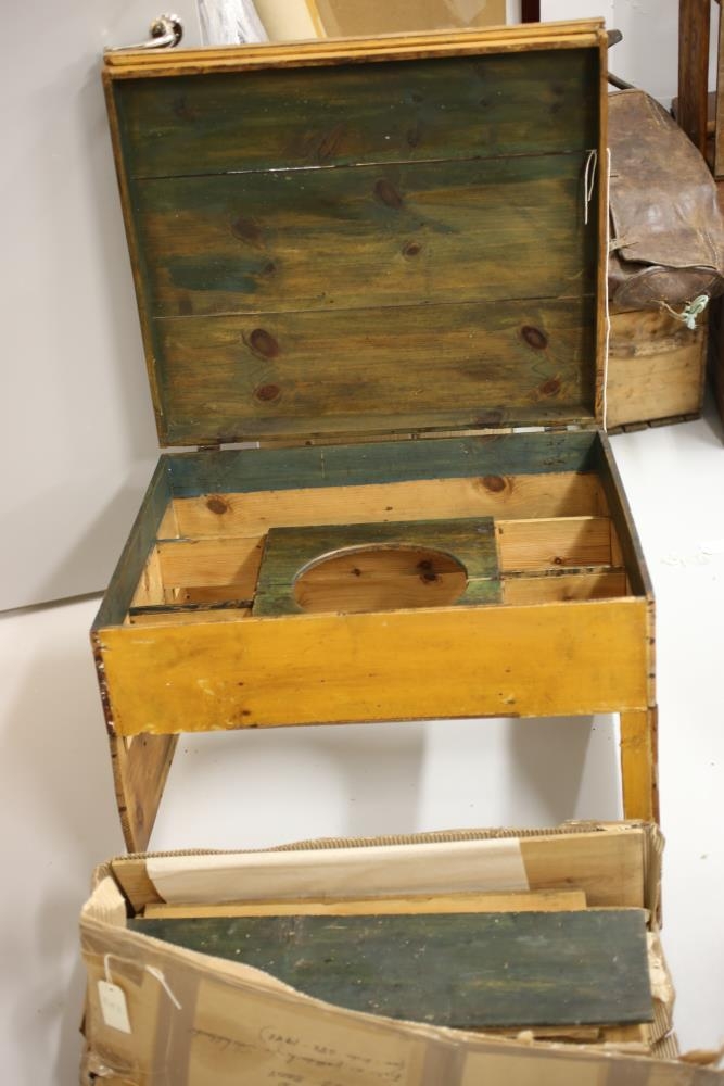 Þvottaborð með loki málað gult. Kringlótt gat ofan á fyrir skál. Viðurinn er grænleitur að innan. Þvottaborðið var á Skriðuklaustri.