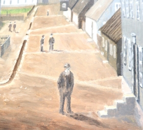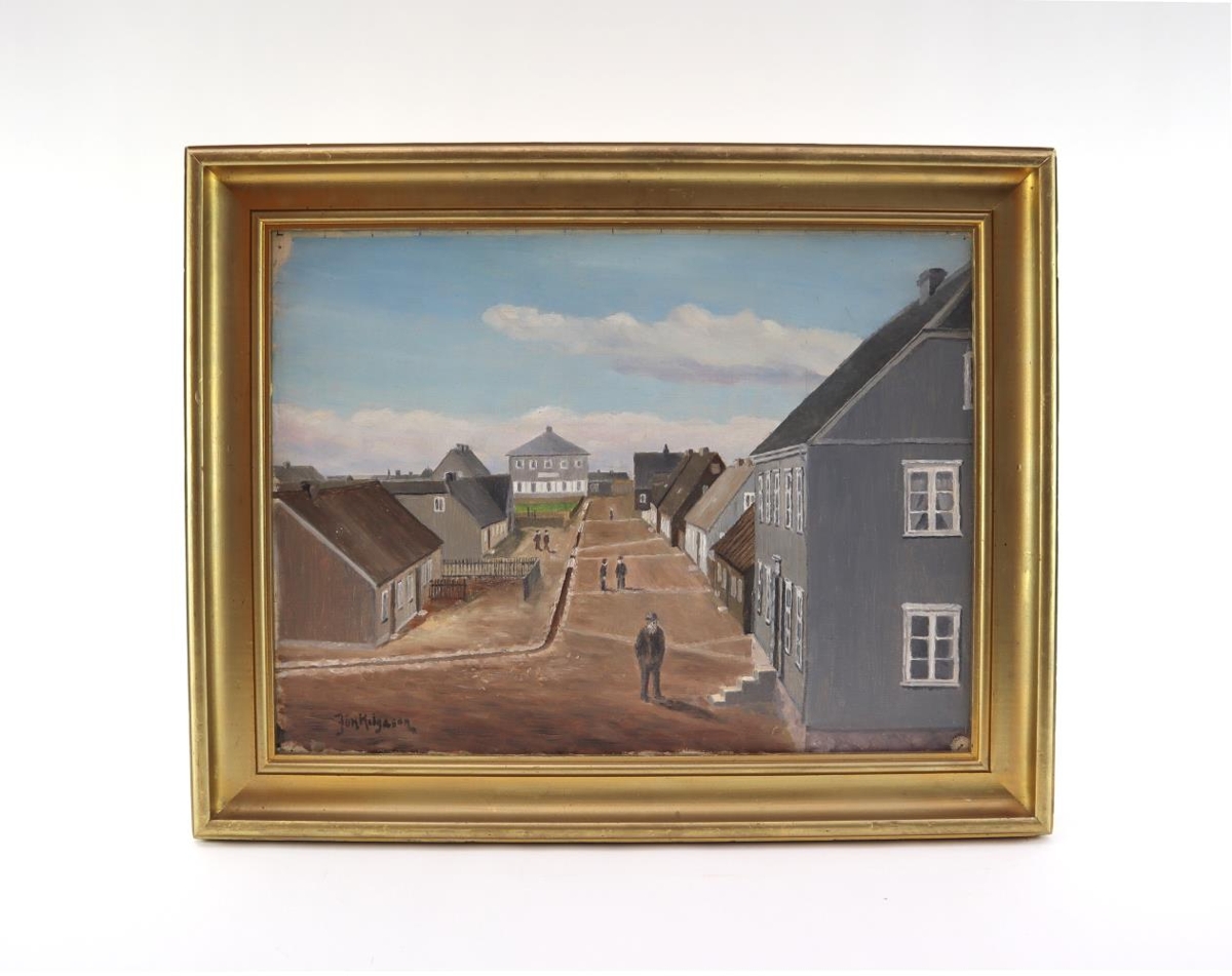 Málverk eftir Jón Helgason: Aðalstræti um 1870. Sjúkrahús bæjarins er við enda götunnar. Olíulitir á lérefti.