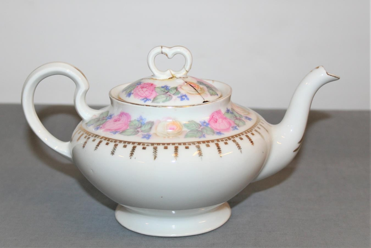 Hvít tekanna. Rósabakki ofan á og á loki. Fínleg kanna.